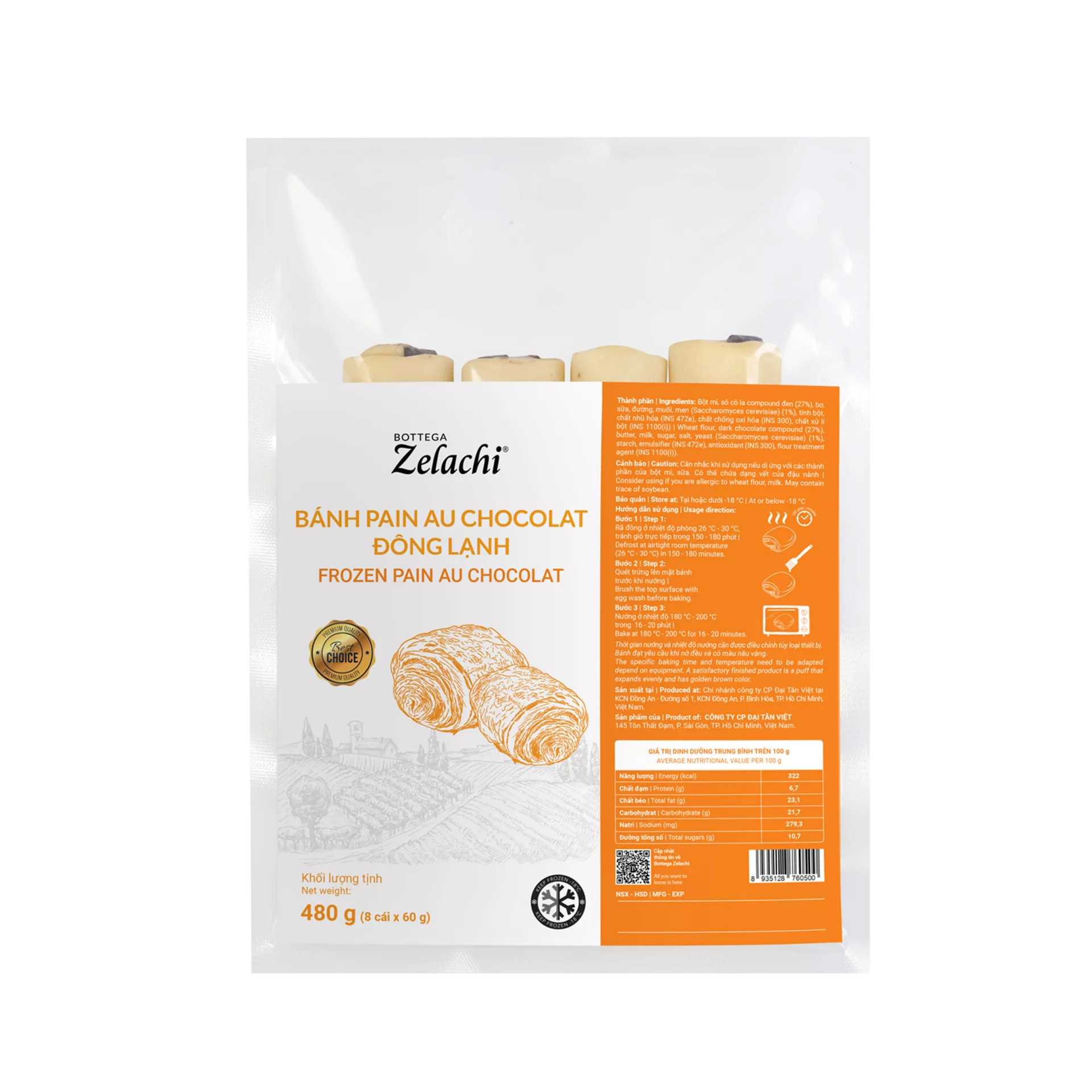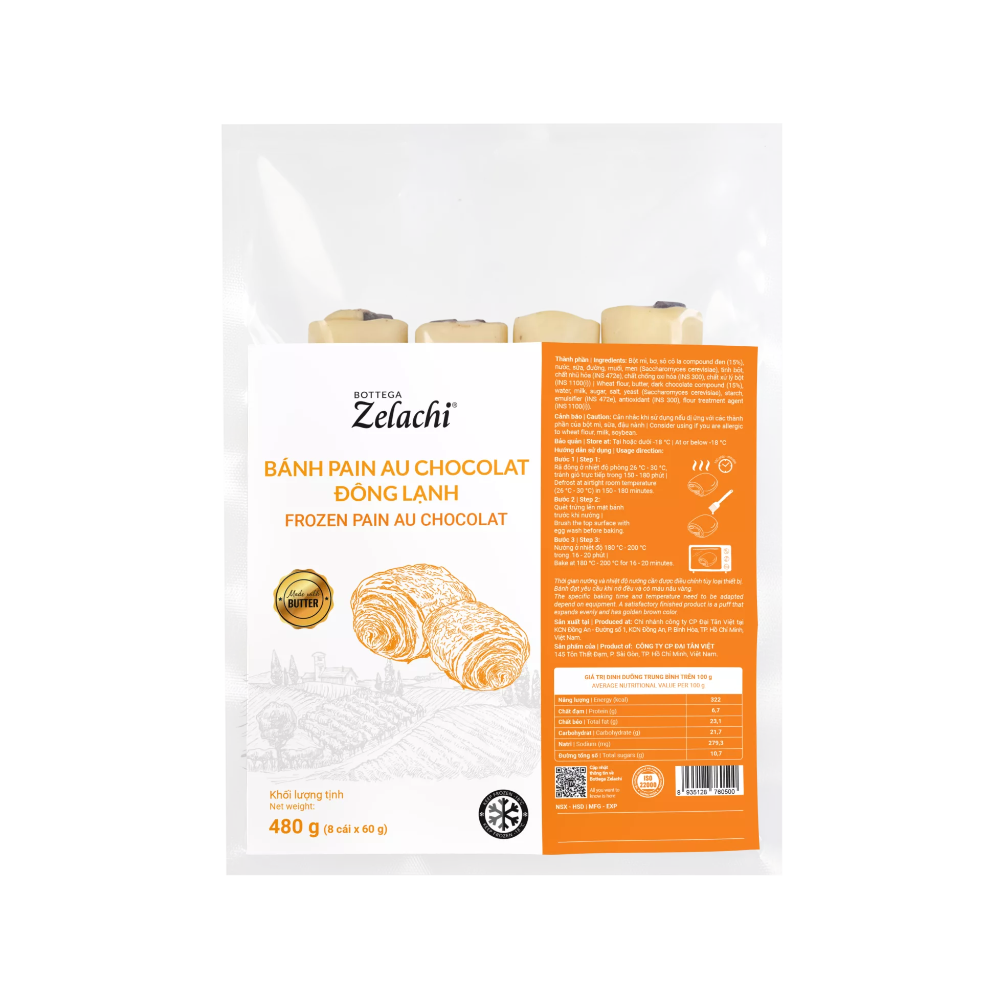 Wheat flour, dark chocolate compound, butter, milk, sugar, salt, yeast (Saccharomyces cerevisiae), starch
