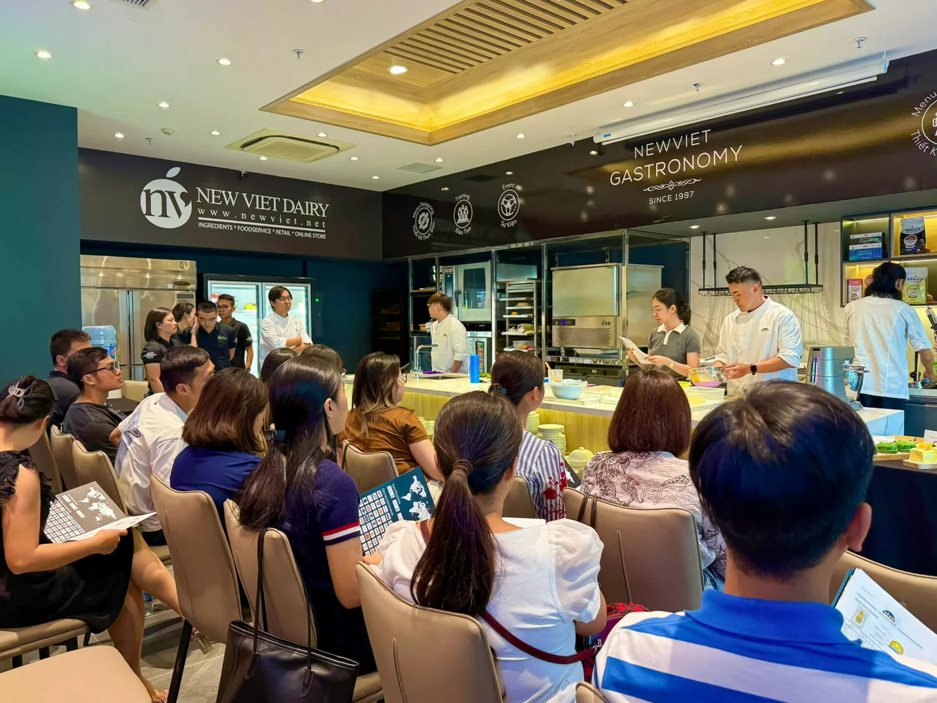 Khách hàng bakery chuyên nghiệp và đội ngũ kinh doanh New Viet Dairy đã có cơ hội quý báu để quan sát, trao đổi kỹ thuật chuyên môn và trực tiếp trải nghiệm hương vị thực tế qua bốn món bánh demo đầy ấn tượng: Lemon Blanc Tart, Mango Velvet Cheesecake, Matcha Red Bean Croissant và Brookie.