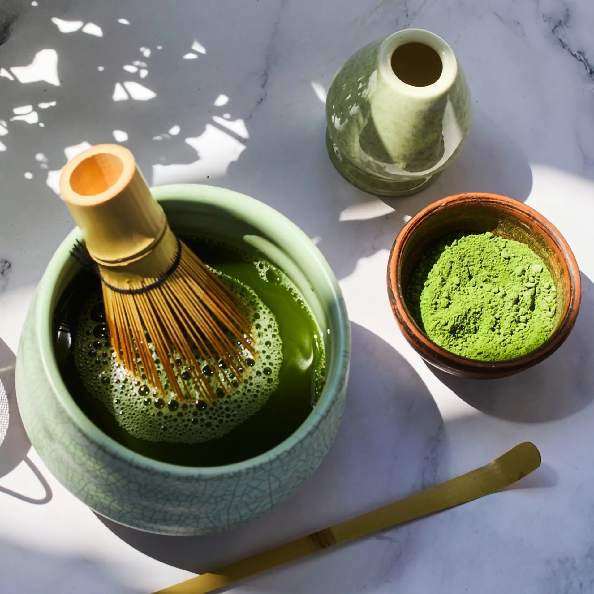 Thưởng thức trà đạo: Pha nguyên bản với nước ấm, đánh bông bằng chổi Chasen để cảm nhận vị ngọt sâu lắng và hương cỏ mới thanh khiết.