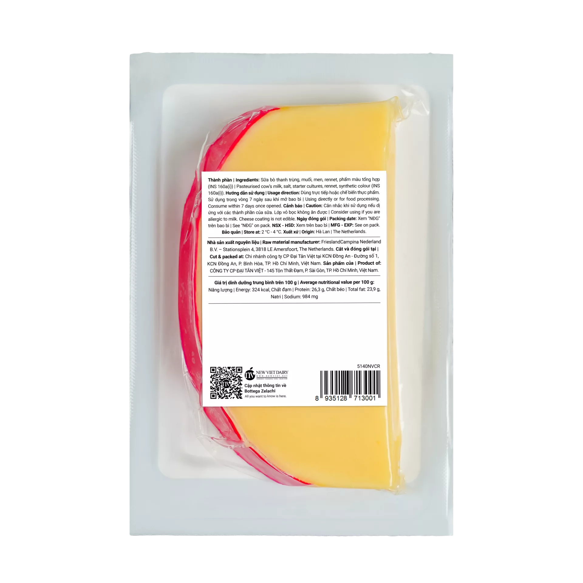 Sữa bò thanh trùng, muối, men, rennet, phẩm màu tổng hợp